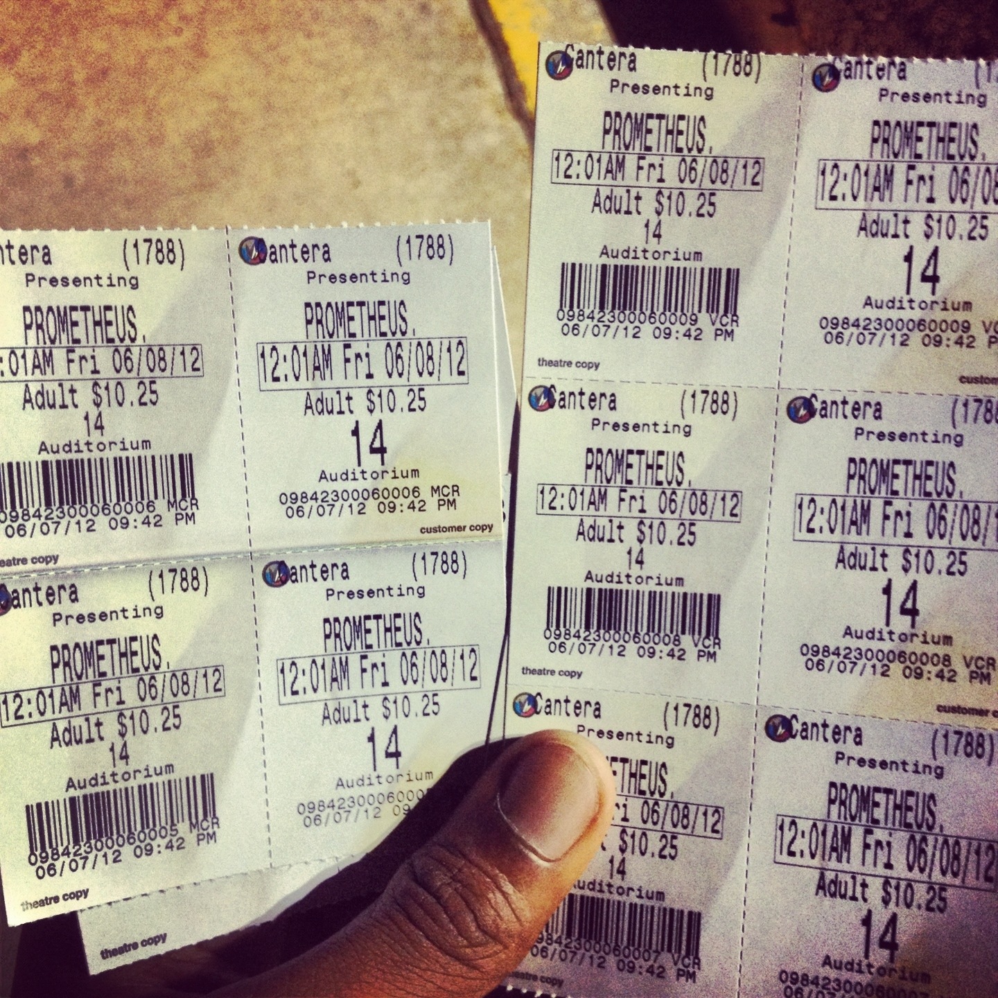 At the movie theater & ready for Prometheus!!! The cool part about this midnight experience is that I haven’t had an anticipation buildup for it. I didn’t really pay attention to the trailer when I saw at in the theater. My sister basically got me interested in it recently, so I’m gonna watch it (plus the NBA & other companies have helped hype it). Let’s get surprised!!
