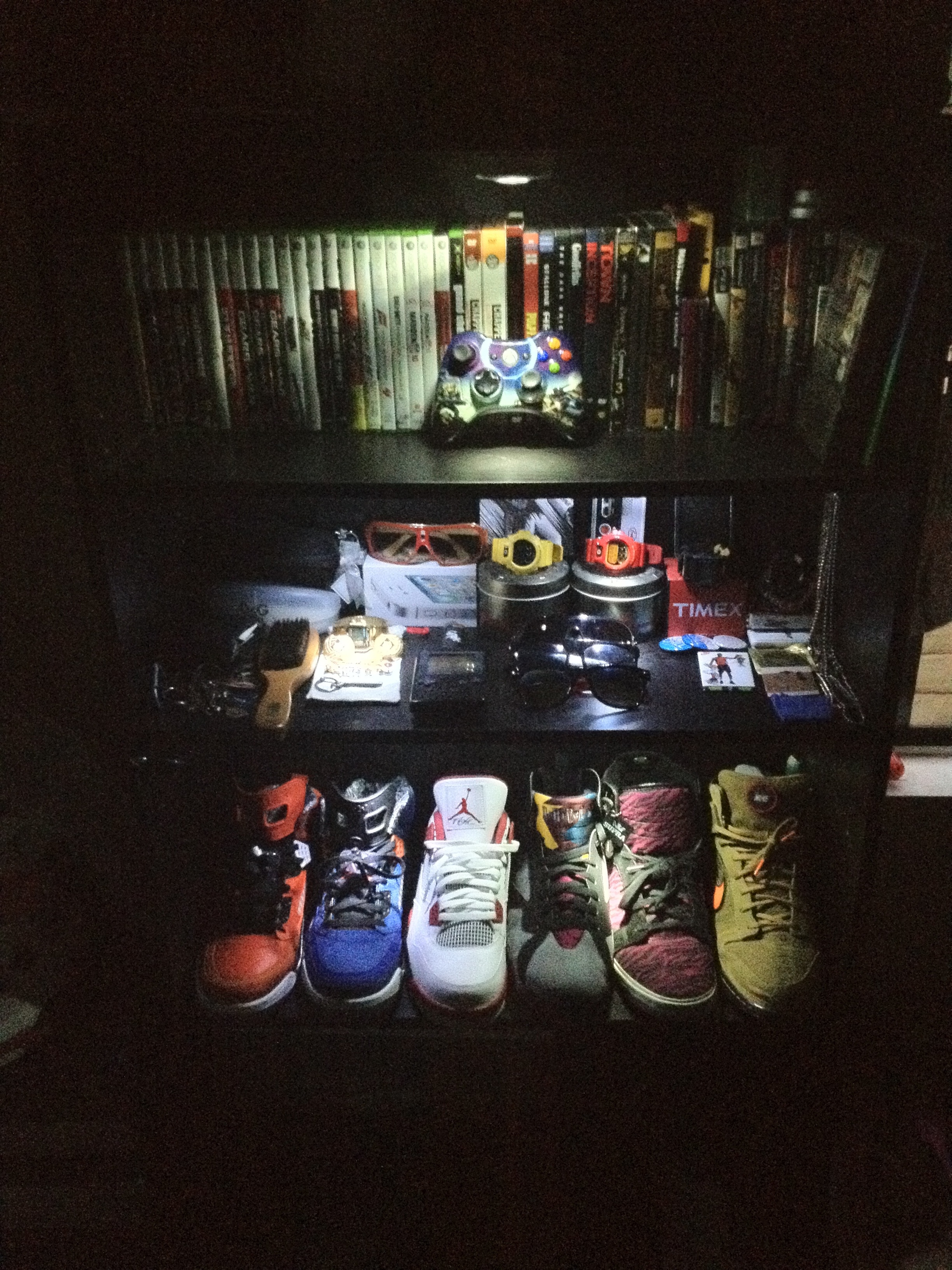 This bookcase has been amazing so far! It was $30 at Target! I love the clean black look! So, I figured it would be great to try my idea of displaying my shoes (Supra, Nike, jordans, etc), DVDs, & fashion items. And, it works! But, after buying LED lights for the shelves, it works even better!