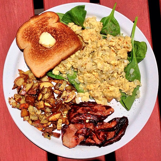Scrambled eggs, spinach, potatoes, ham, and toast