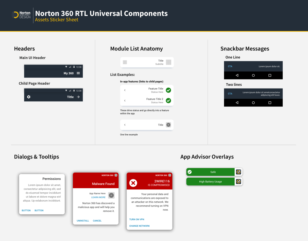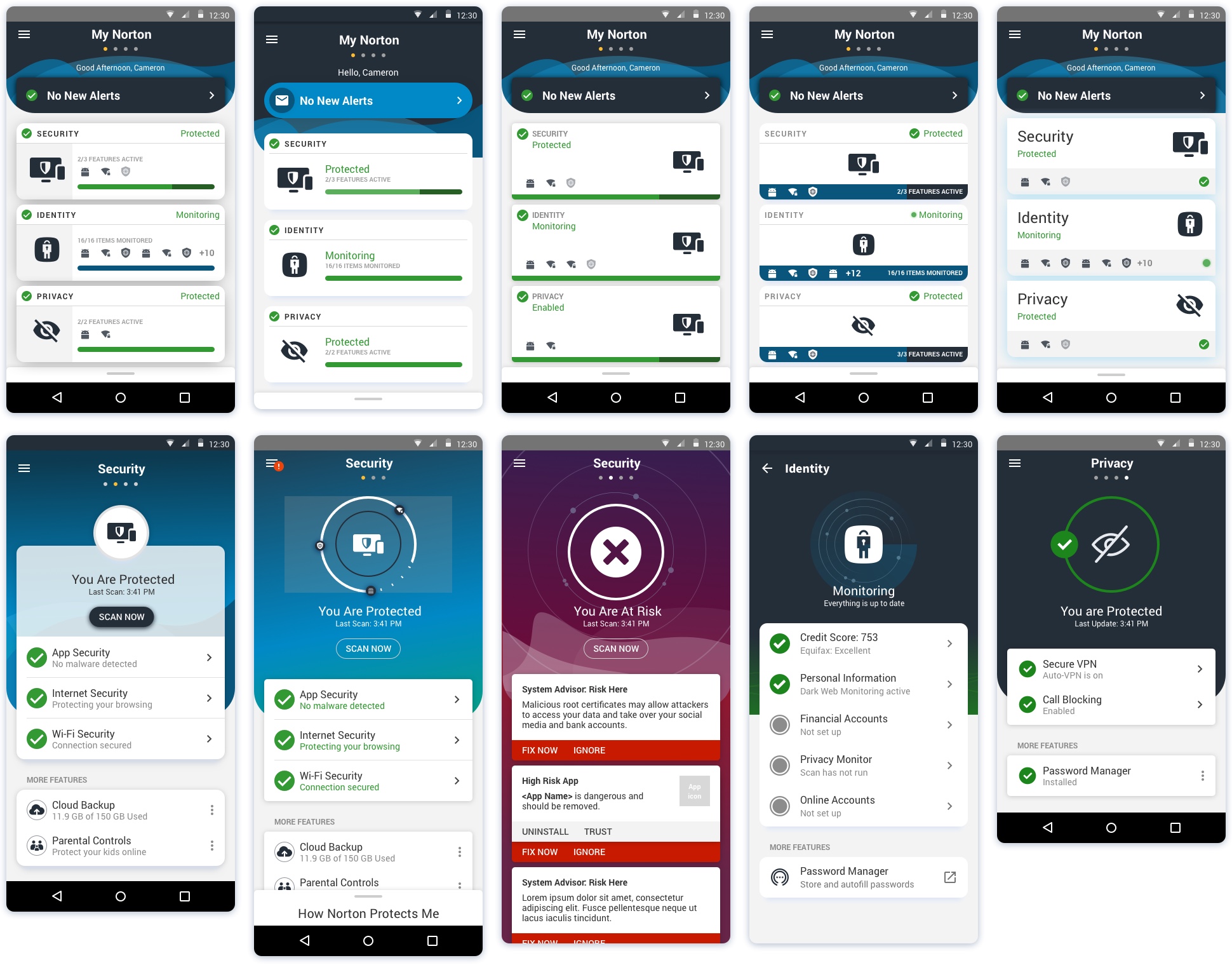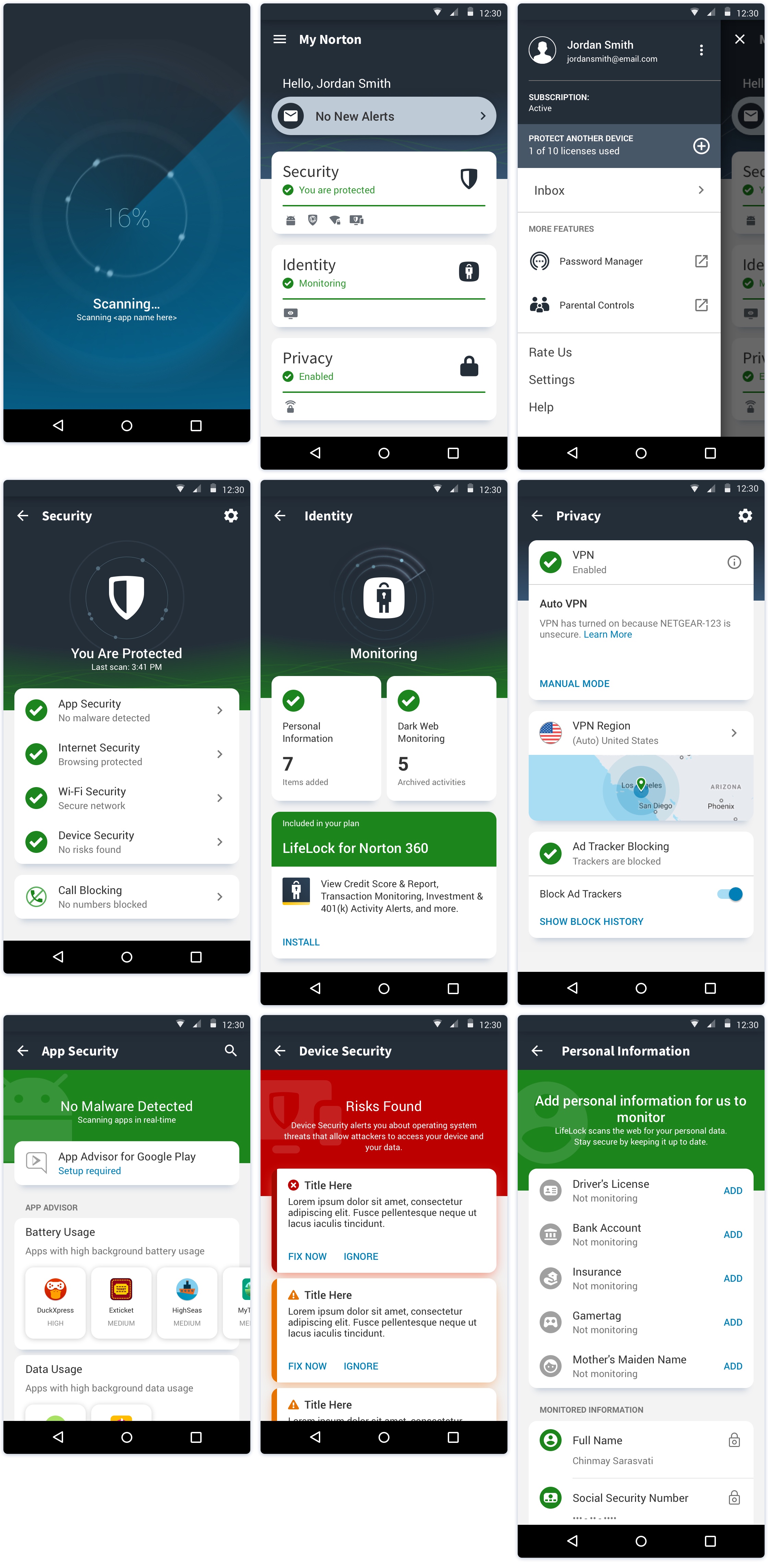 After setting the stage for the final look and feel and getting buy-in from our UX leadership, I set a design standard for our team to abide by. I was able to develop the Norton 360 app style in the main UI, scan, Security, and other areas in order allow my designers to apply the styles in our Identity and Privacy areas. Additionally, I worked with our interaction designer to carry out the vision for an app that felt alive as she worked to bring the app to life with animations and transitions. It was important to tap into the psychology of users by creating a design that feels alive with looping animations of waveforms/unique feature graphics and sleek transitions—this gives customers the sense that their protection is always active as we check for threats in the background.