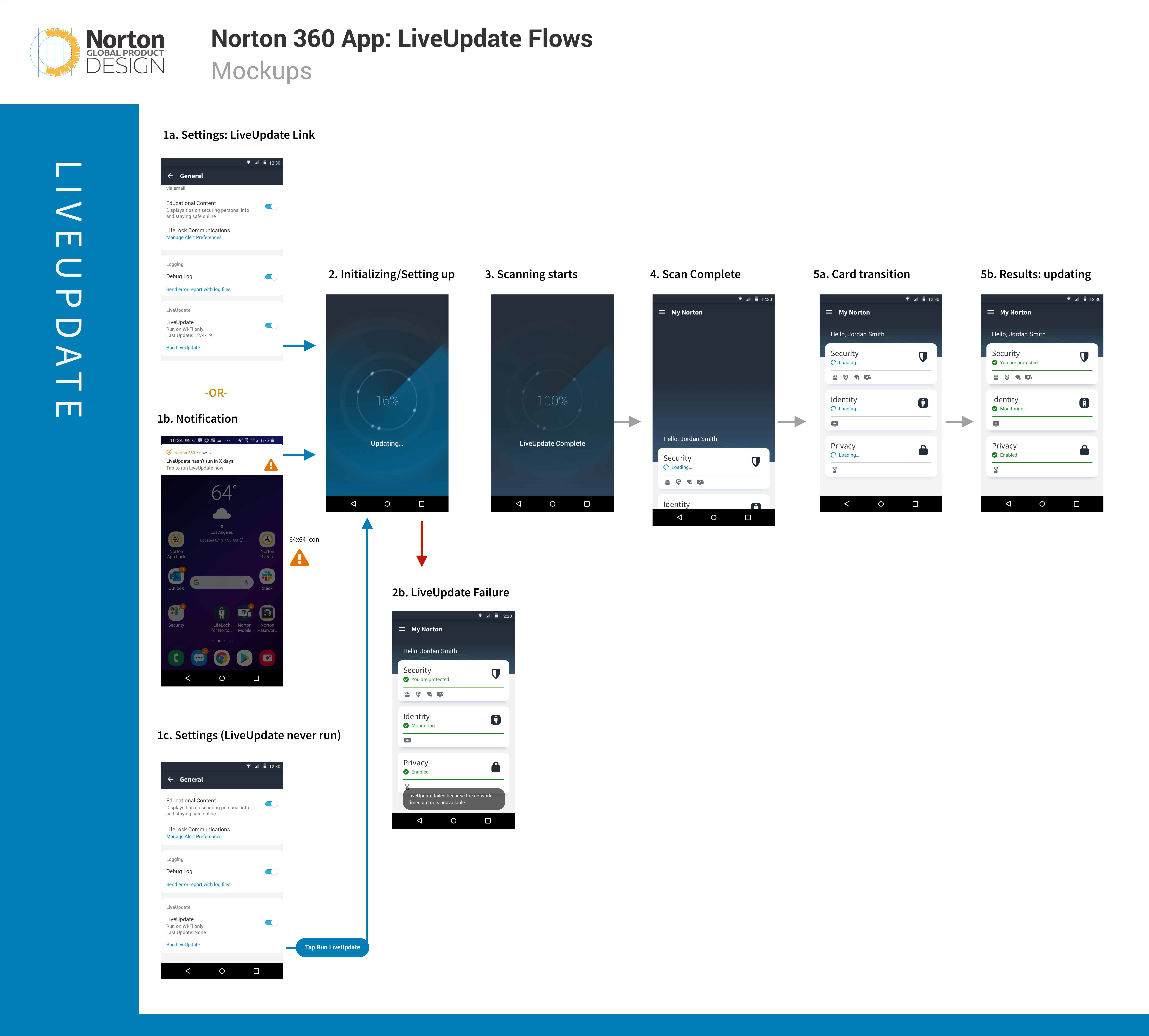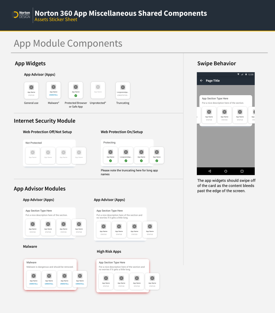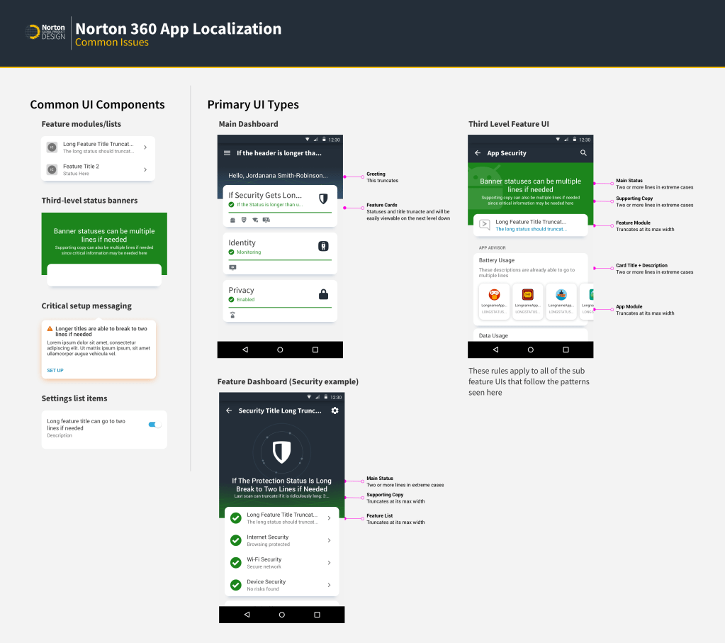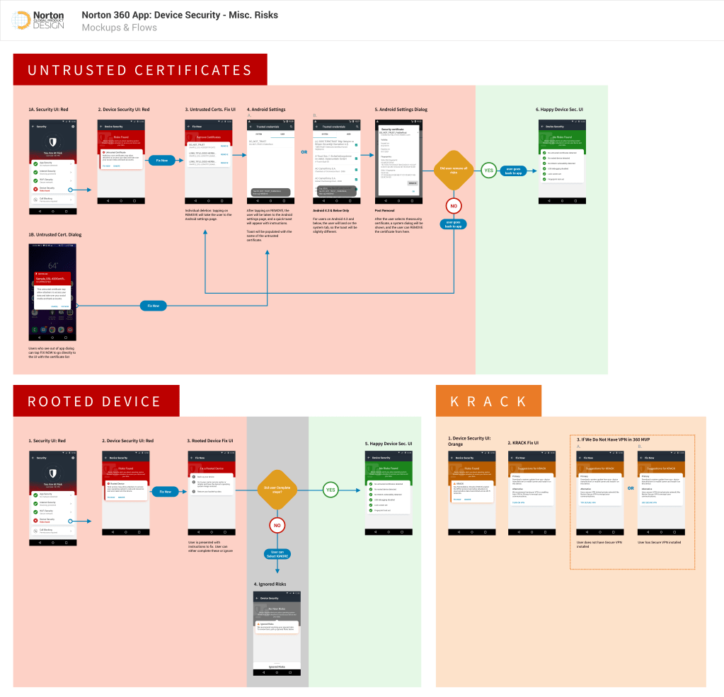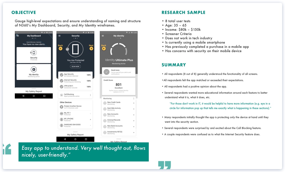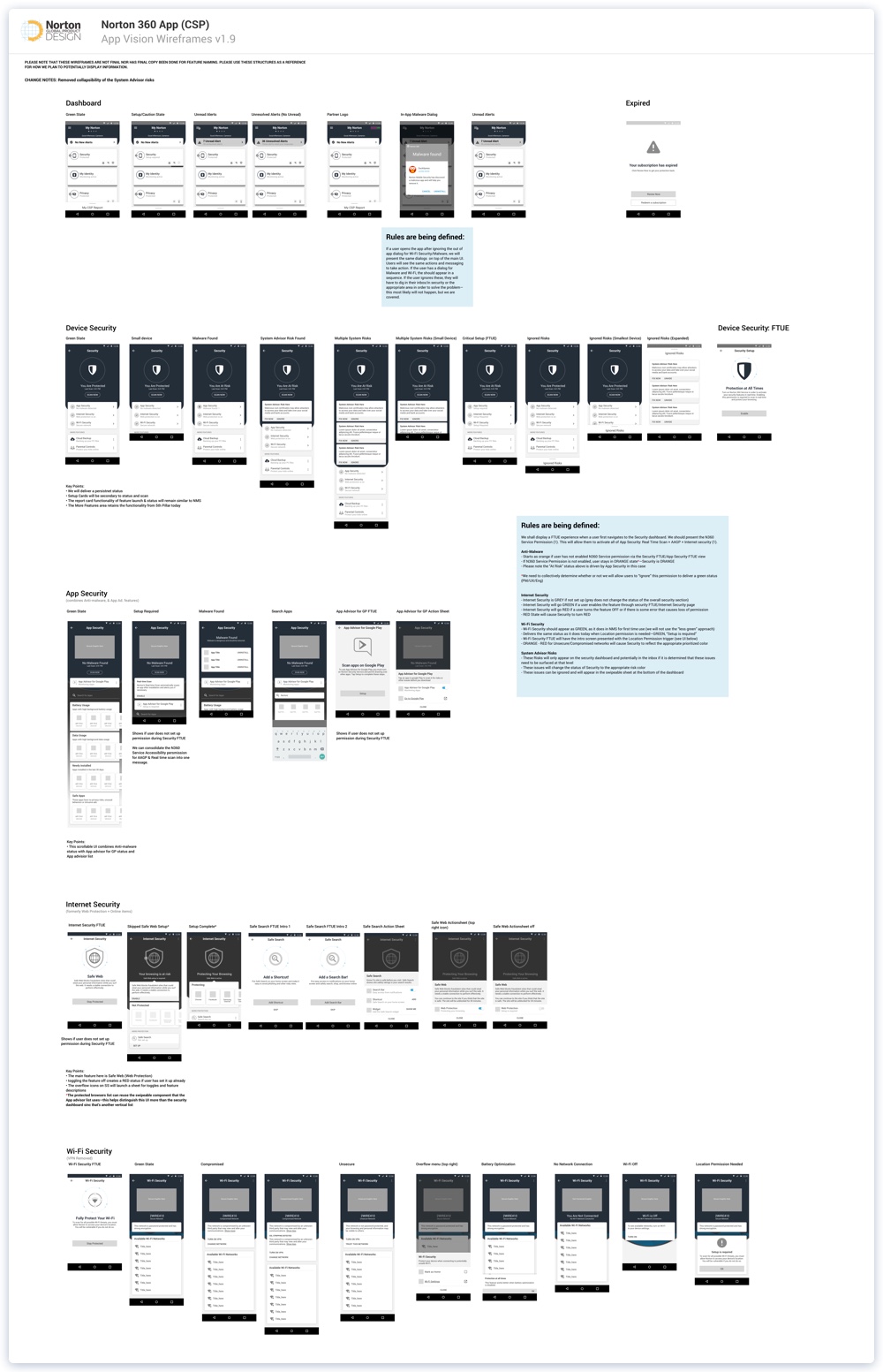 As the product UX owner, I participated in the bi-weekly demo reviews for the app. I also installed app builds on a mobile phone to check for defects that may not have been caught—I compiled an extensive list and coordinated with a variety of engineering teams to ensure that the defects were filed, fixed, and the app was updated to Norton design standards.