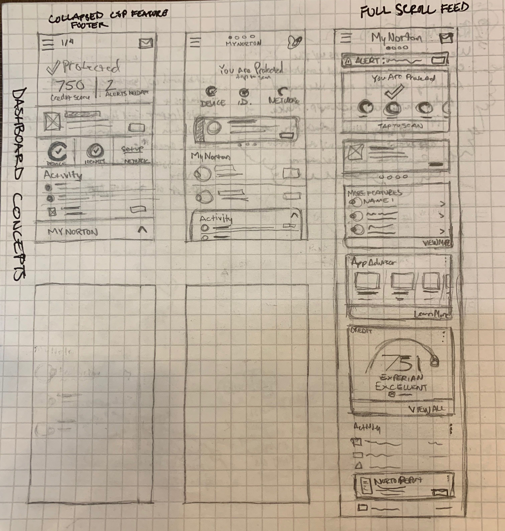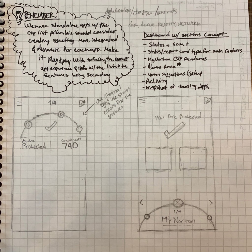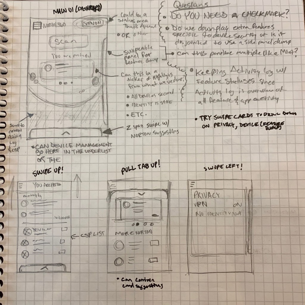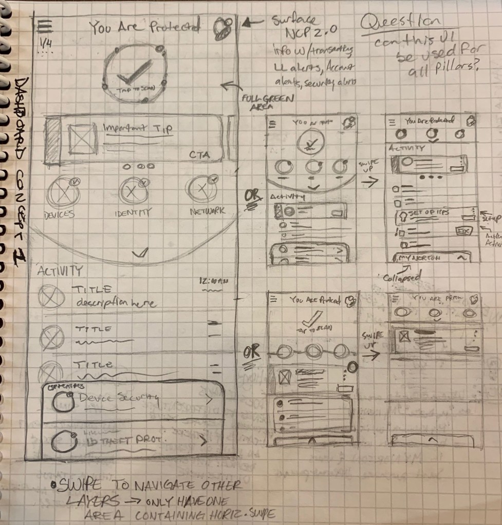 The interaction model, main UI dashboard, feature dashboard UIs, and more were considered in this phase. Iterating quickly through sketching helps organize all of the raw information that was distilled in the earlier phases.