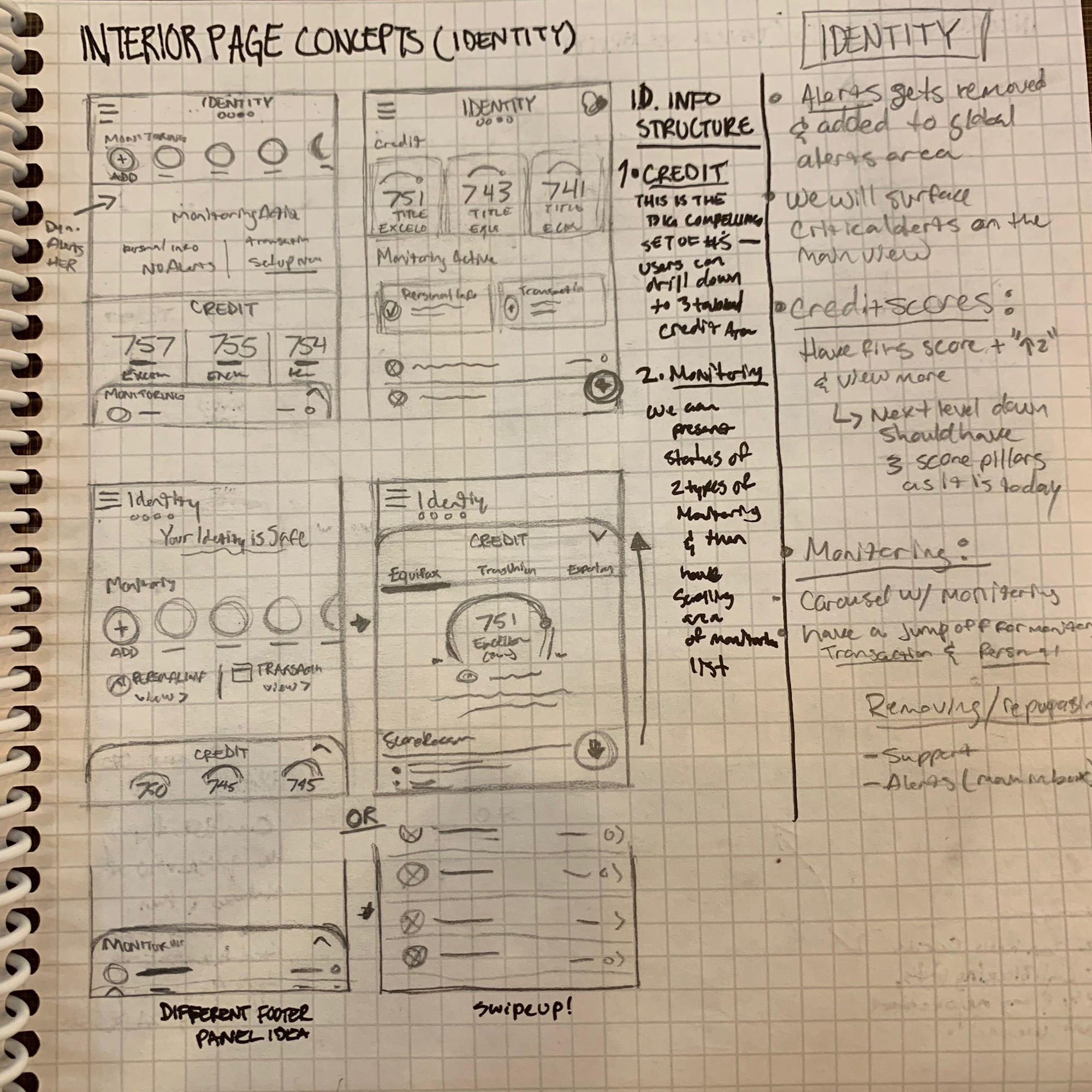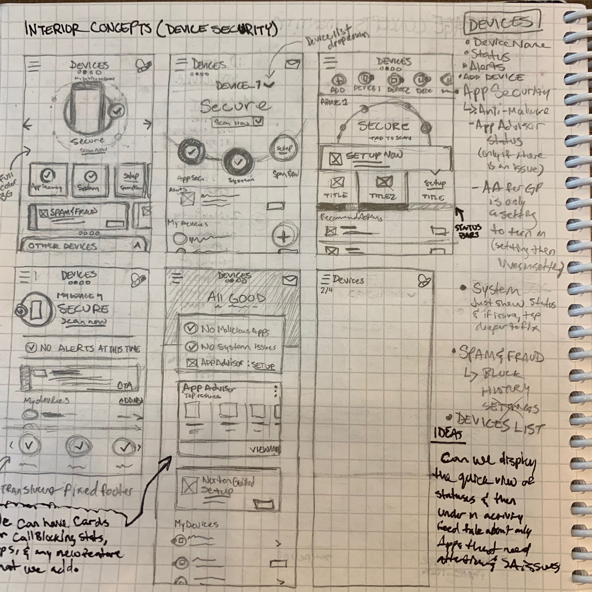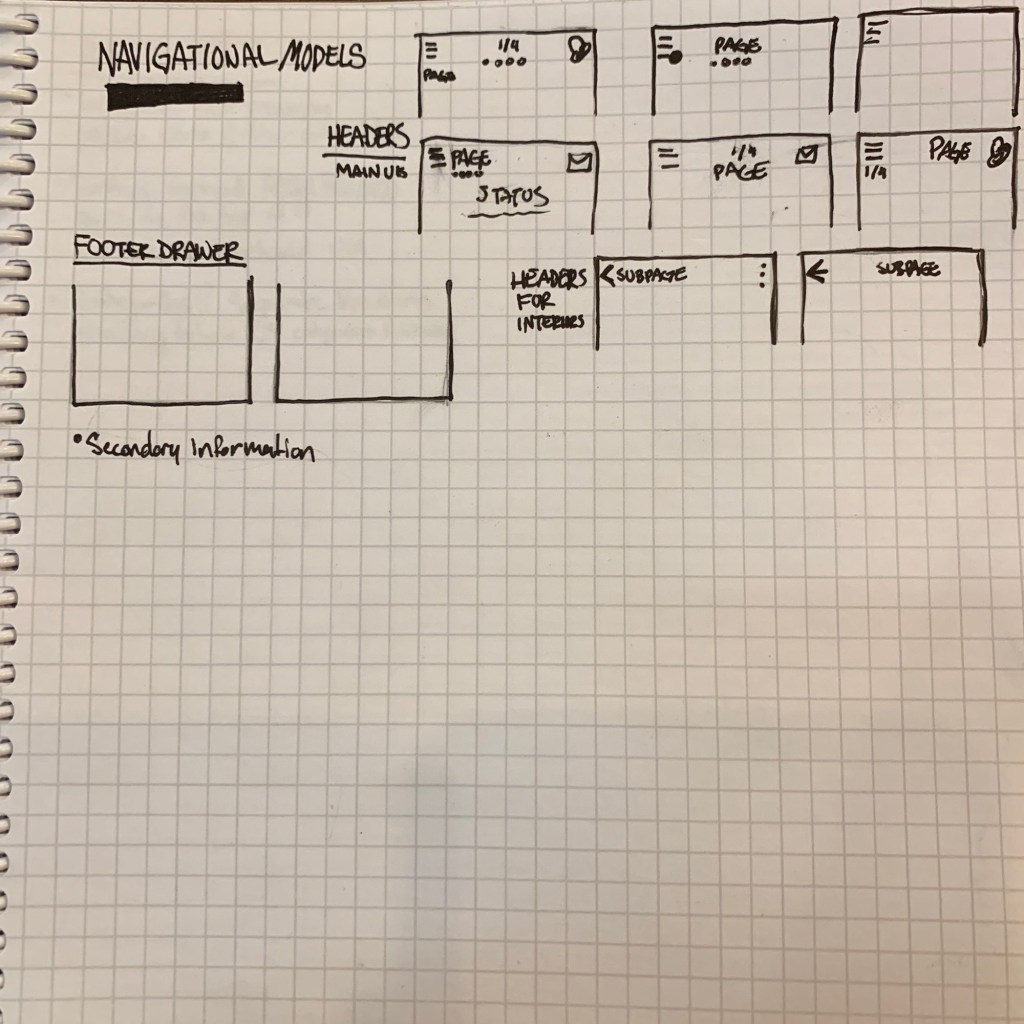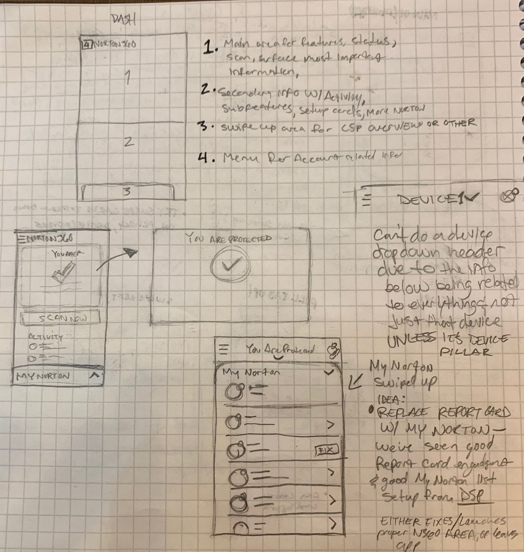 The interaction model, main UI dashboard, feature dashboard UIs, and more were considered in this phase. Iterating quickly through sketching helps organize all of the raw information that was distilled in the earlier phases.