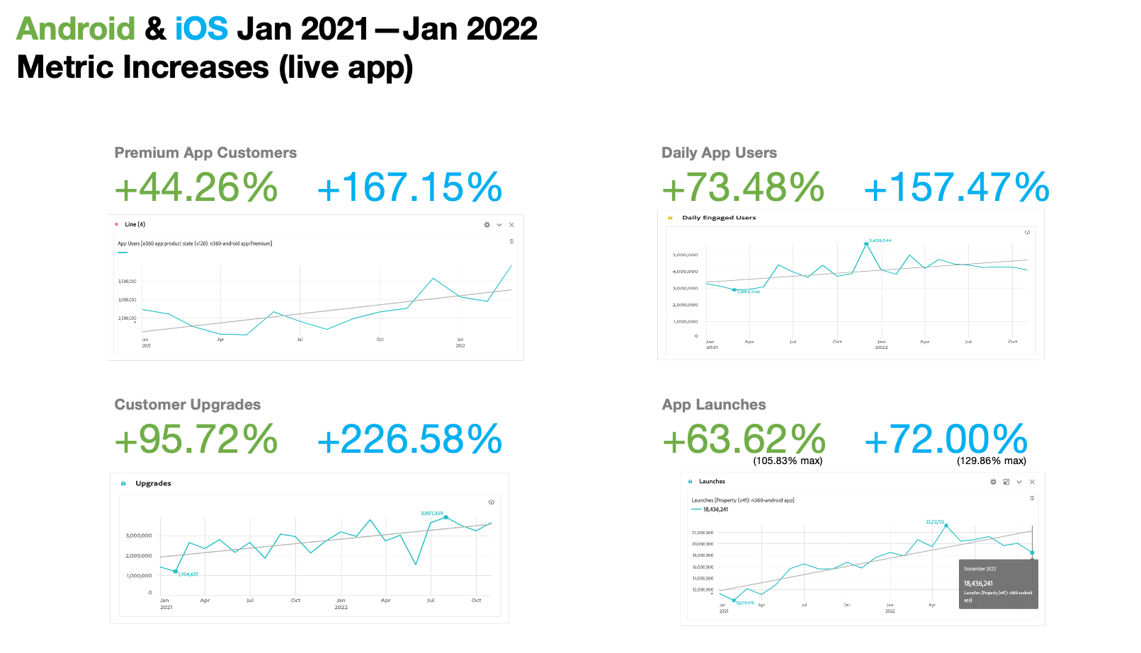 - Customer satisfaction with their ease of use with core features of their subscription in one app vs. three+